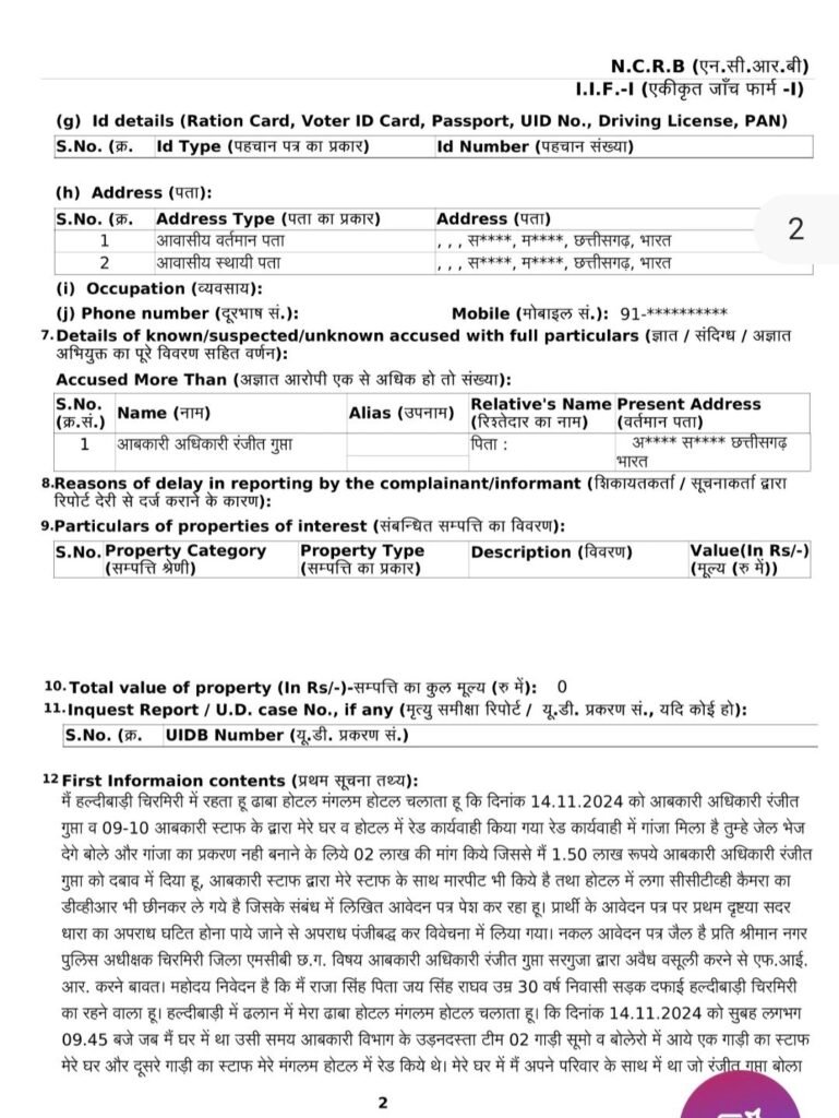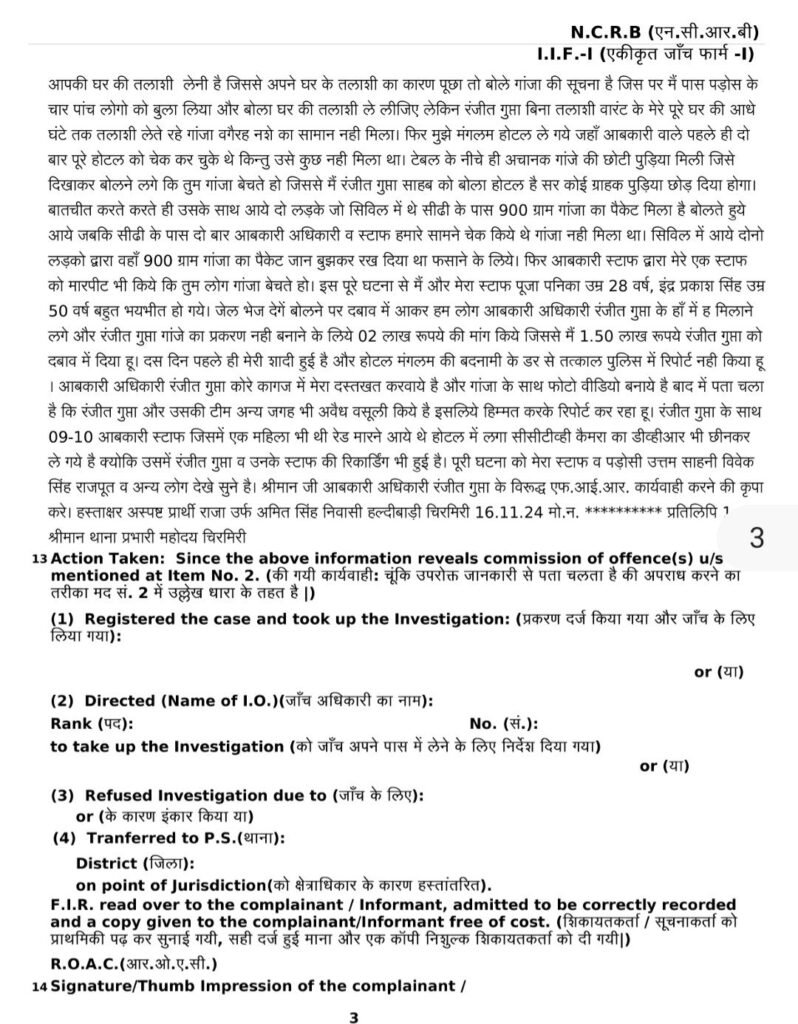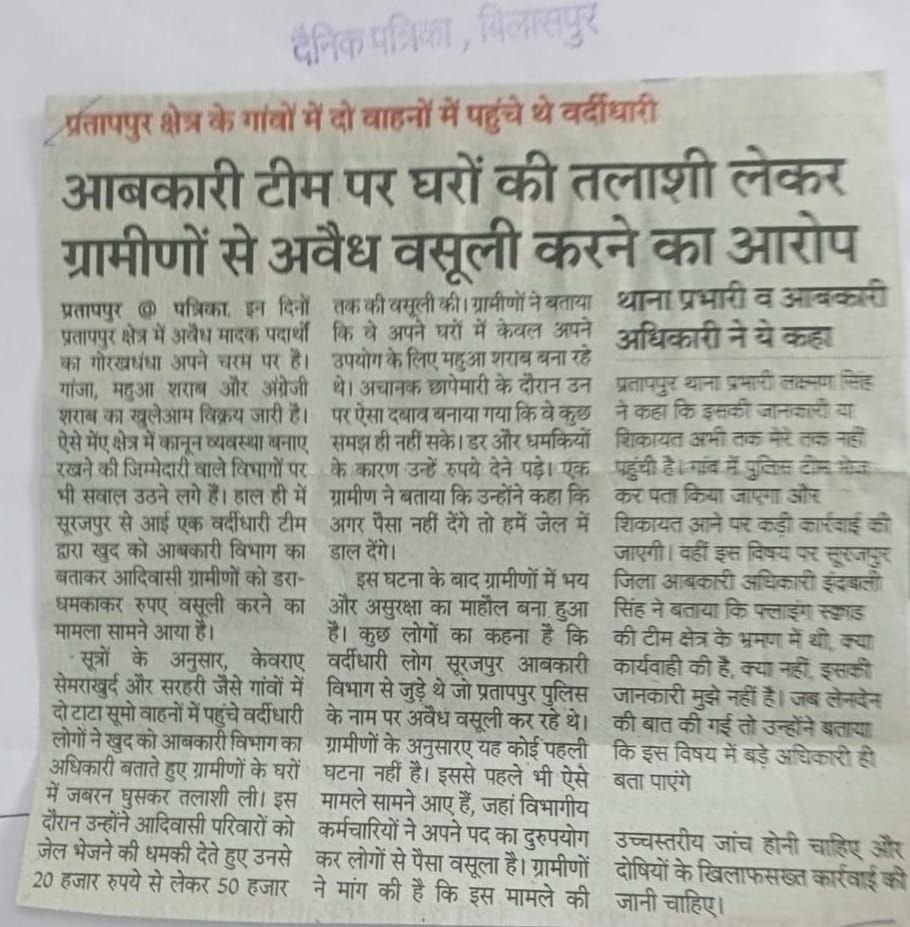 एक कर्तव्यनिष्ठ अधिकारी के ऊपर ऐसे आरोप लगना तो आम बात है। अपने रामानुजगंज के आलीशान निवास को छोड़ उड़नदस्ते में लगातार छापेमारी करना सच में कोई साधारण बात नहीं। लोग तो ऐसे ही आरोप लगाते रहते हैं कि साहब डरा धमकाकर पैसे ऐंठ लेते हैं और न देने पर झूठा प्रकरण बनाकर जेल भेज देते हैं। लेकिन सत्यनाद ऐसी बातों की पुष्टि नहीं करता किंतु एक प्रश्न अवश्य है कि FIR के लगभग ढाई माह पश्चात भी पुलिस की कार्यवाही क्या किसी दबाव में कमजोर है??